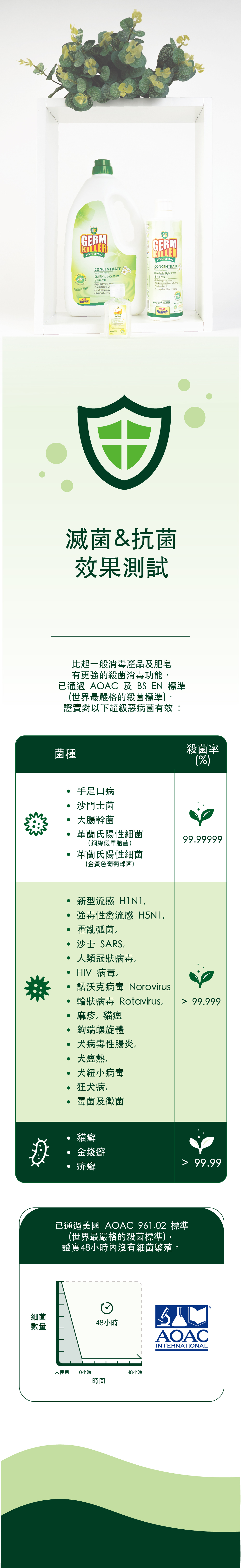 - GK淨可立 (Surface) 長效抗菌保護長達30天,其作用時間只需1分鐘,對比市面上一般消毒用品需30至60分鐘快了30倍以上。