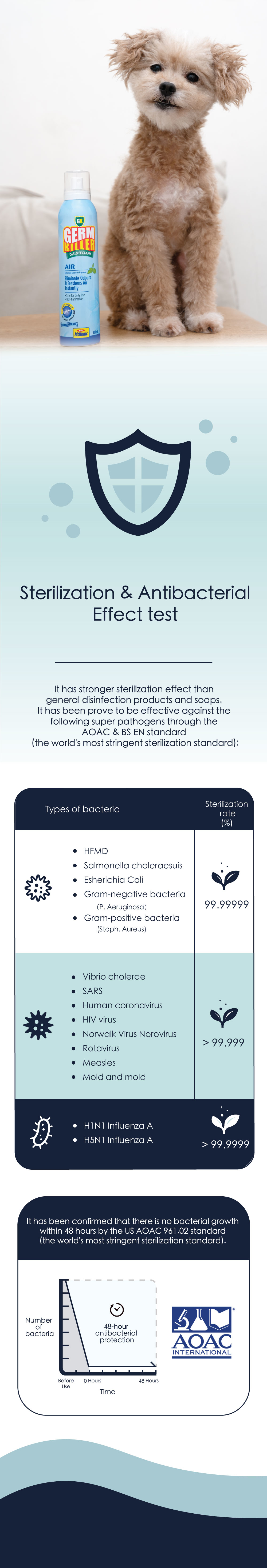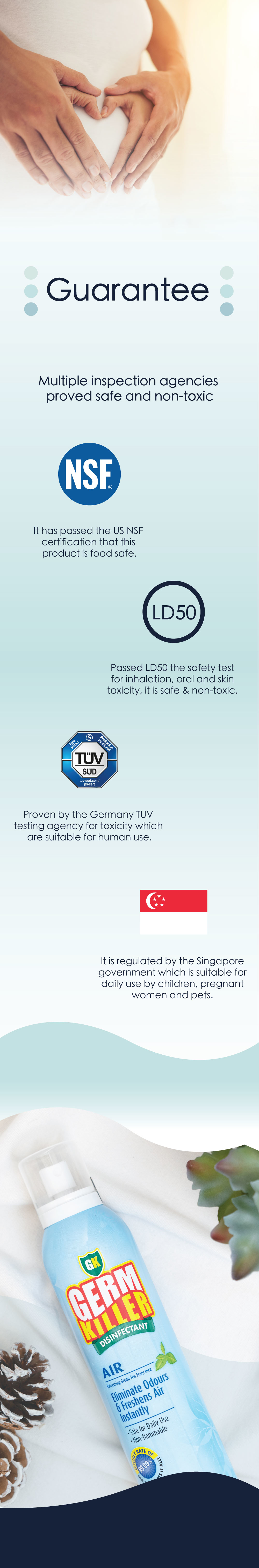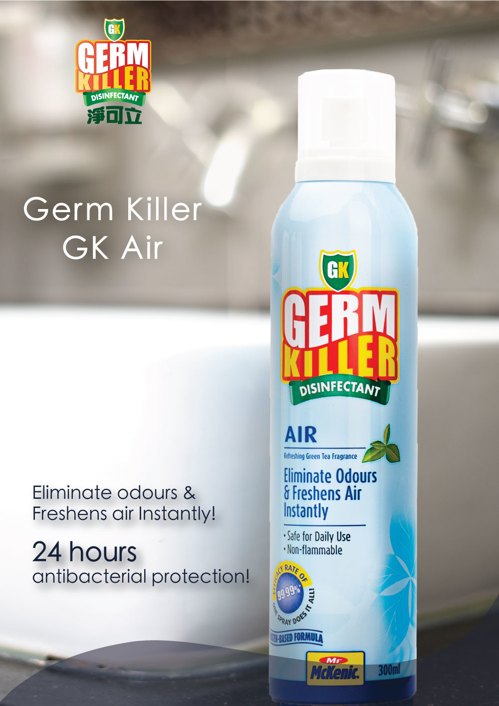GK Air is a premium water-based disinfectant for the air. Its broad-spectrum bactericidal action kills 99.9999% of germ and improves air quality by actively destroying odour causing bacteria at the source, instead of simply masking the bad odour with fragrance. The formula is non-toxic, non-irritating to skin and is safe for daily indoor use. Convenient and ready-to-use, the product introduces an instant and lasting burst of freshness into your surroundings.