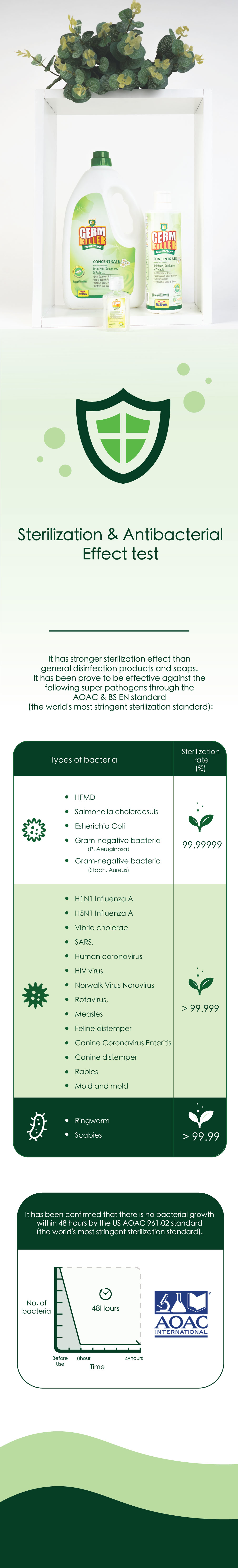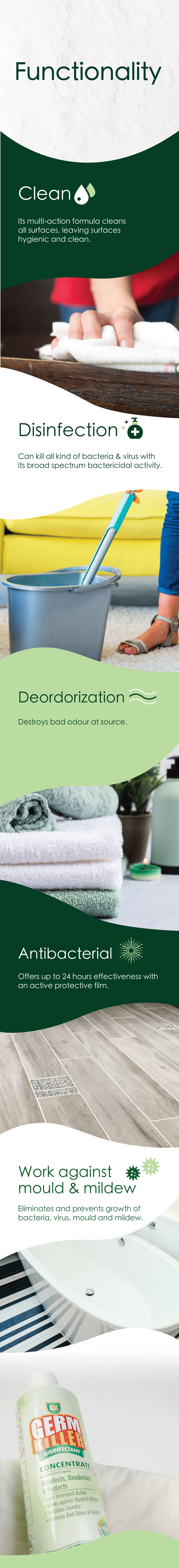 Disinfects: Eliminates and prevents growth of bacteria, virus, mould and mildew.