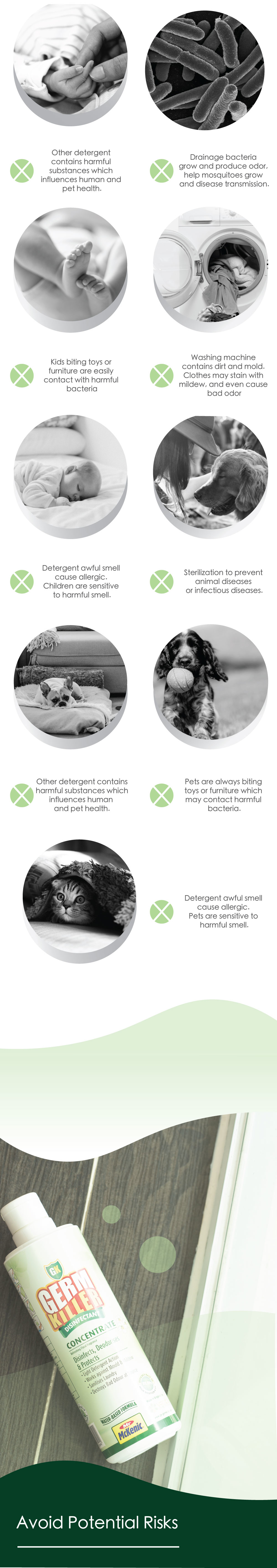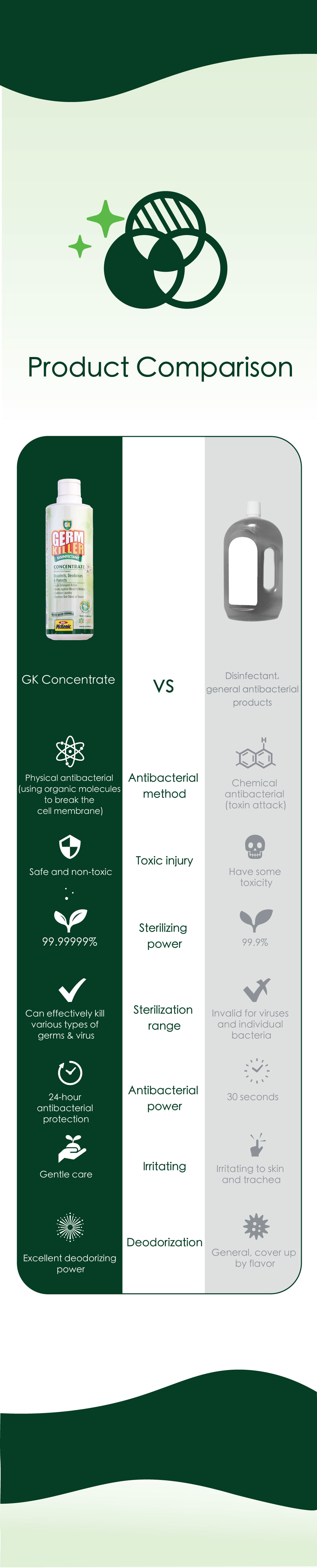 GK Concentrate is a premium water-based disinfectant with broad spectrum bactericidal activity that kills 99.99999% of germs. This multi-action formula cleans and disinfects all surfaces and leaves a long lasting fragrance that refreshes as it protects. It contains no harsh chemicals and is non-irritating to the skin, making it safe for daily use. It can be applied on fabrics.