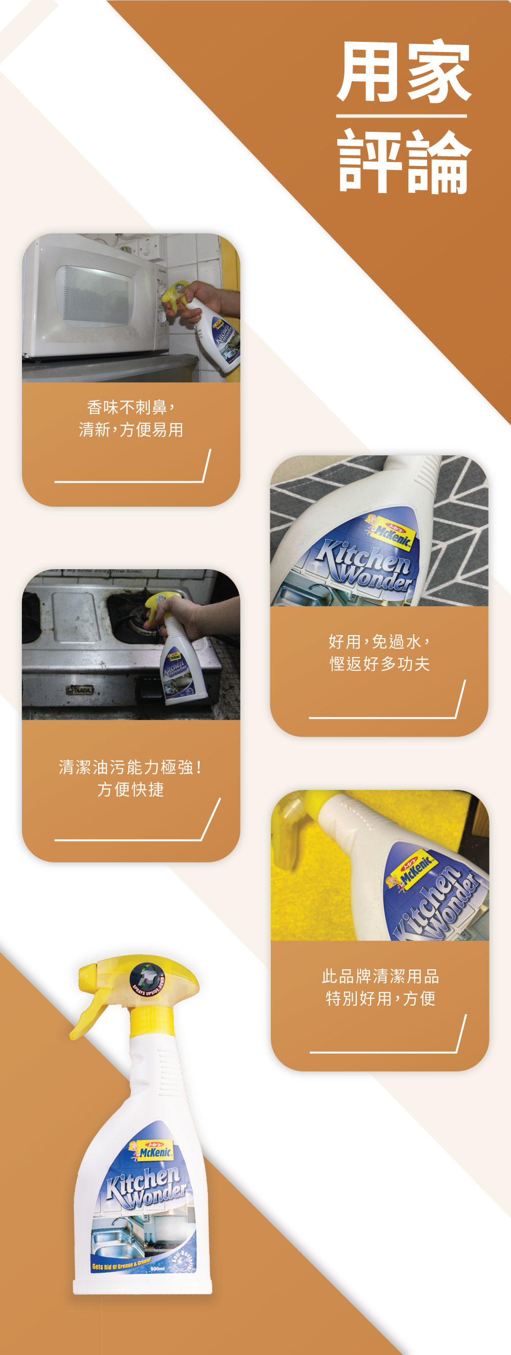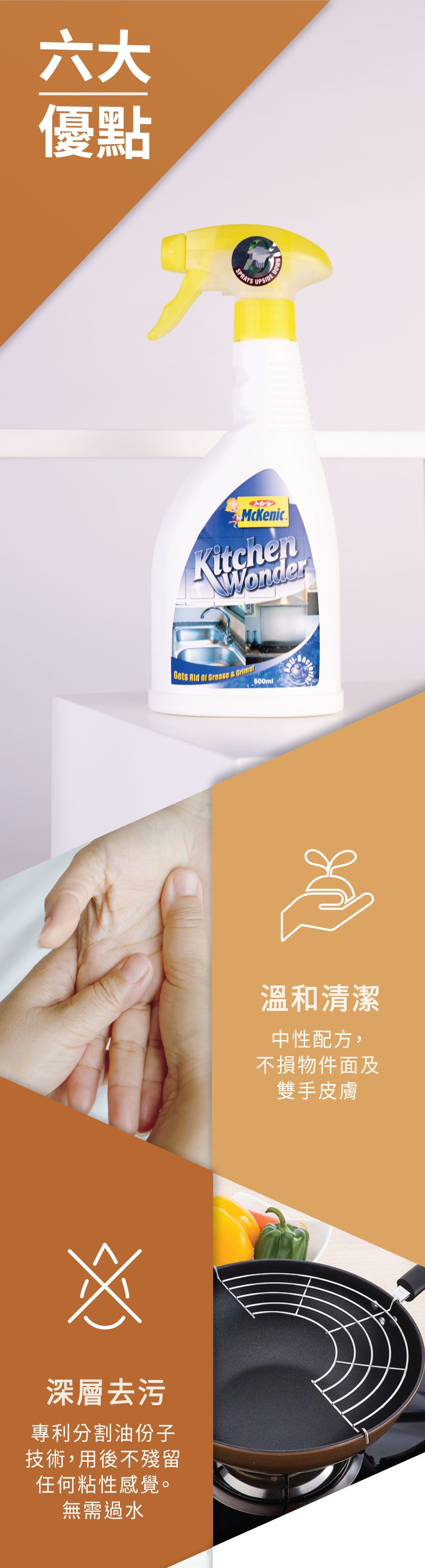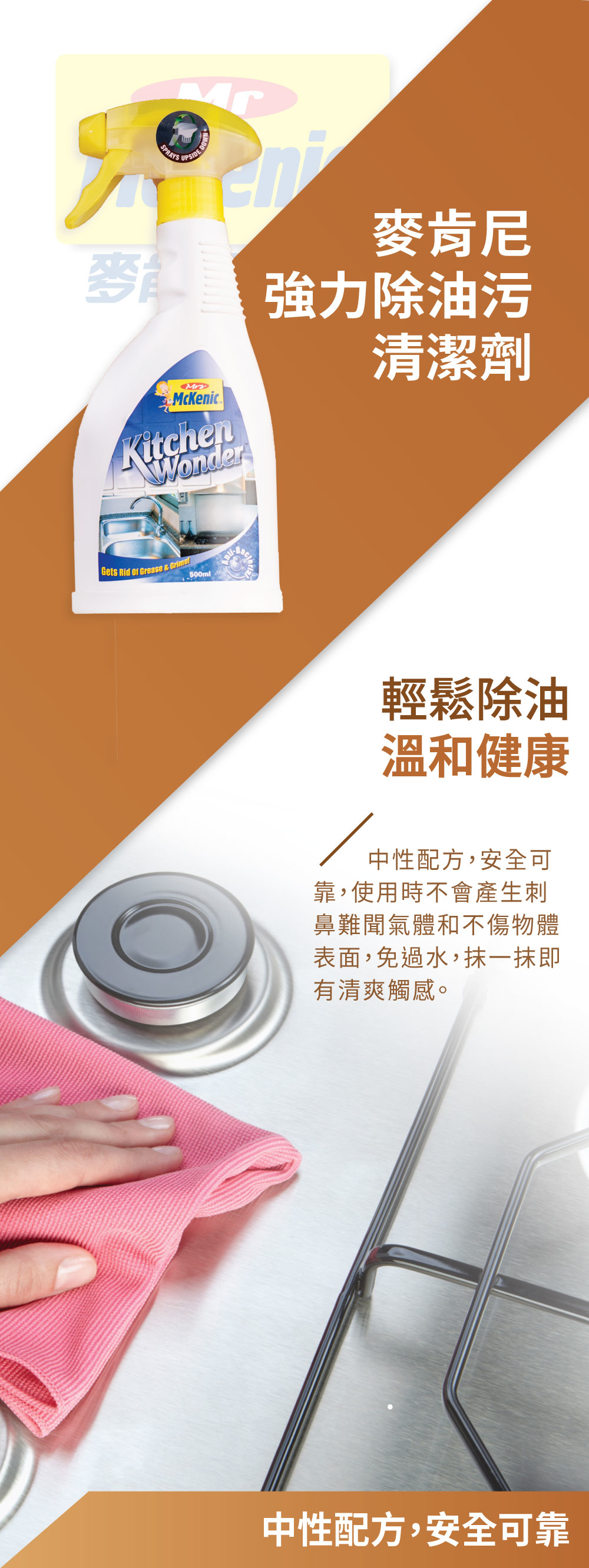 麥肯尼廚房強力去污清潔劑是一款中性配方的清潔用品,安全可靠,更含抗菌配方,針對注意家人健康的人士使用,產品適用於清潔各種廚房用具,有效清除油脂及污垢,使用時不會產生刺鼻難聞氣體和不傷物體表面,不用過水,抹一抹即有清爽觸感。