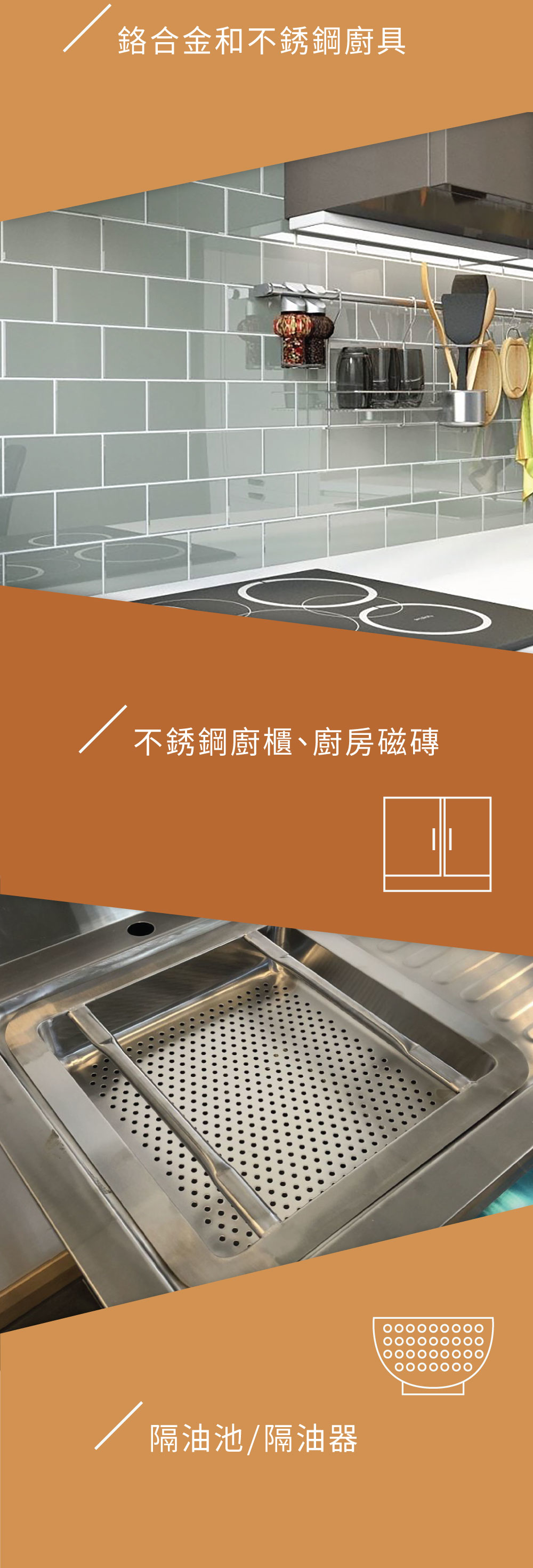 爐灶和抽油煙機 微波爐,冰箱,焗爐 鉻合金和不銹鋼廚具 不銹鋼廚櫃、廚房磁磚 隔油池/隔油器