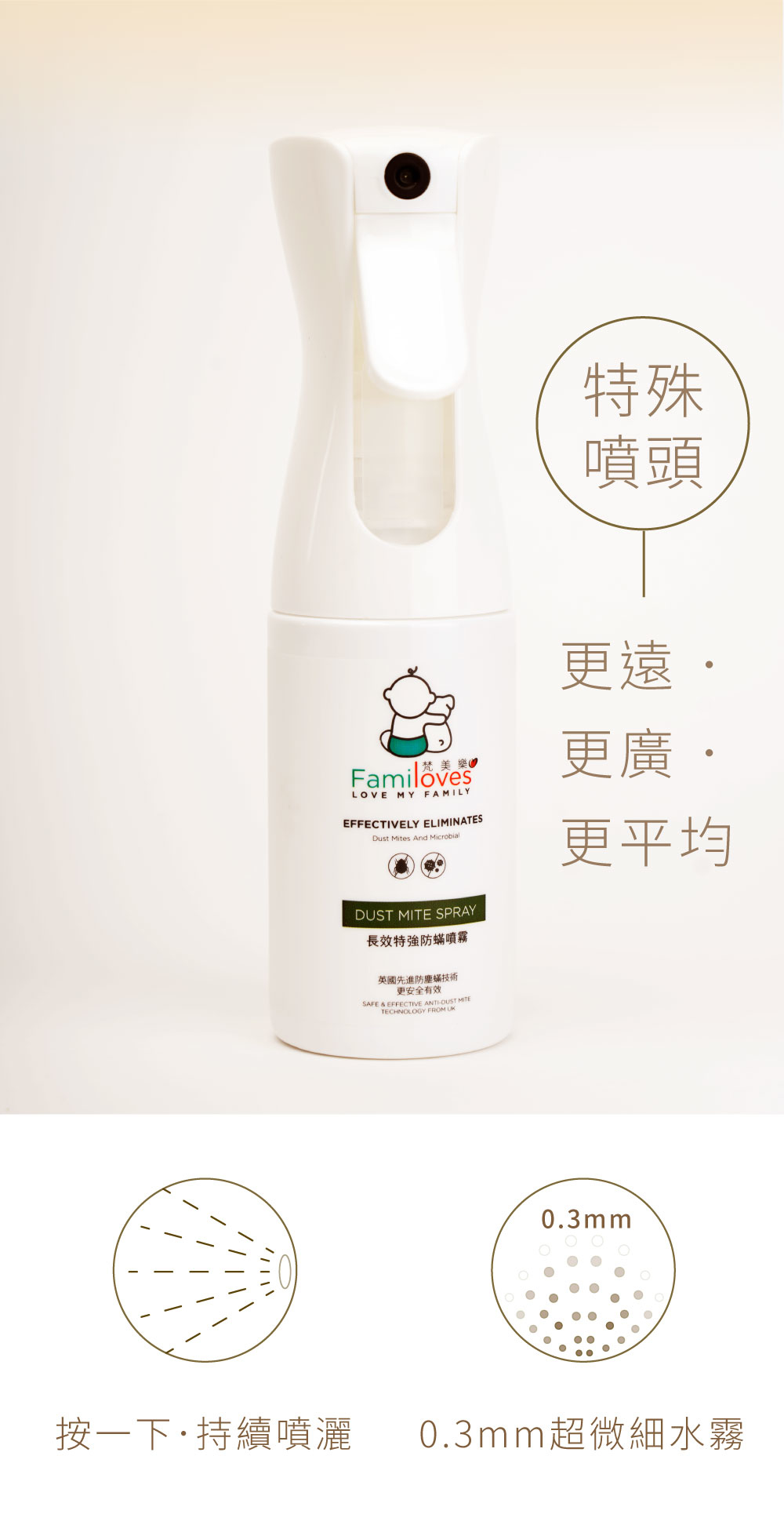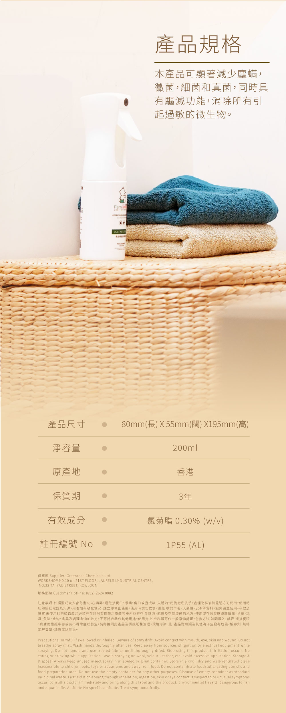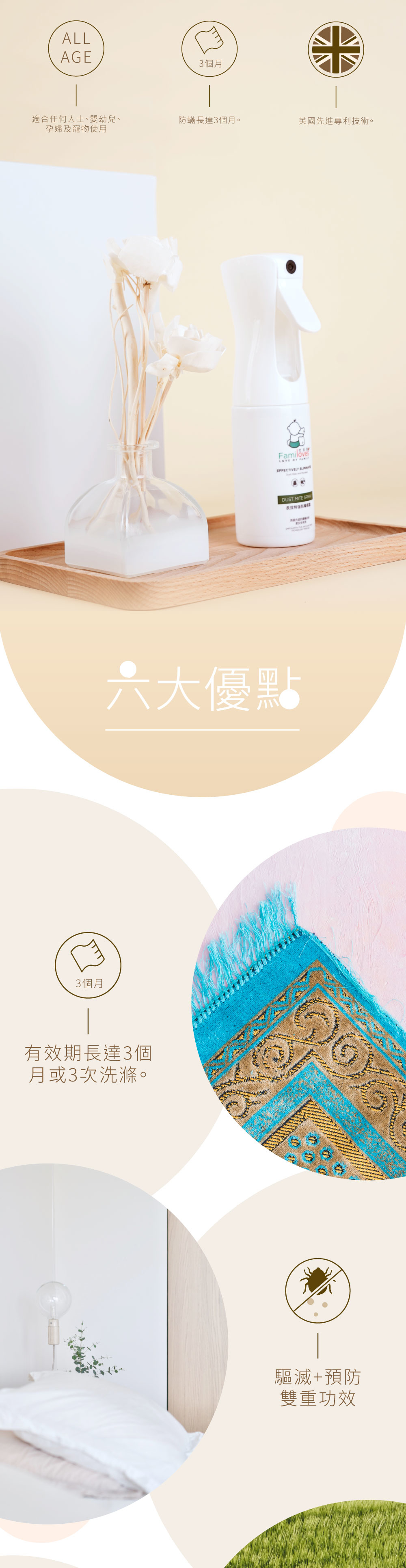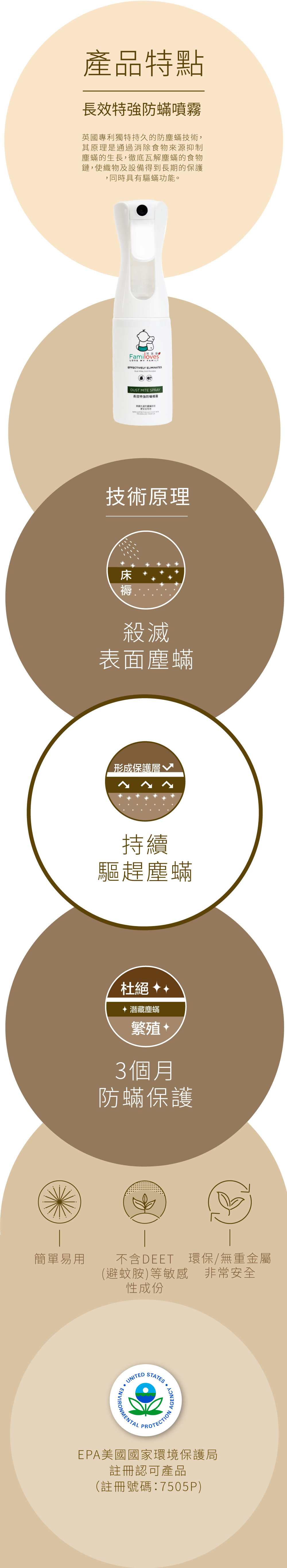 本產品可顯著減少塵蟎,黴菌,細菌和真菌的數量。它通過消除食物來源抑制塵蟎的生長,徹底瓦解塵蟎的食物鏈,使織物及設備得到長期的保護,同時具有驅蟎功能。消除所有引起過敏的微生物,創造一個健康的環境。經處理的織物將持續有效期3個月或多達20次洗滌。