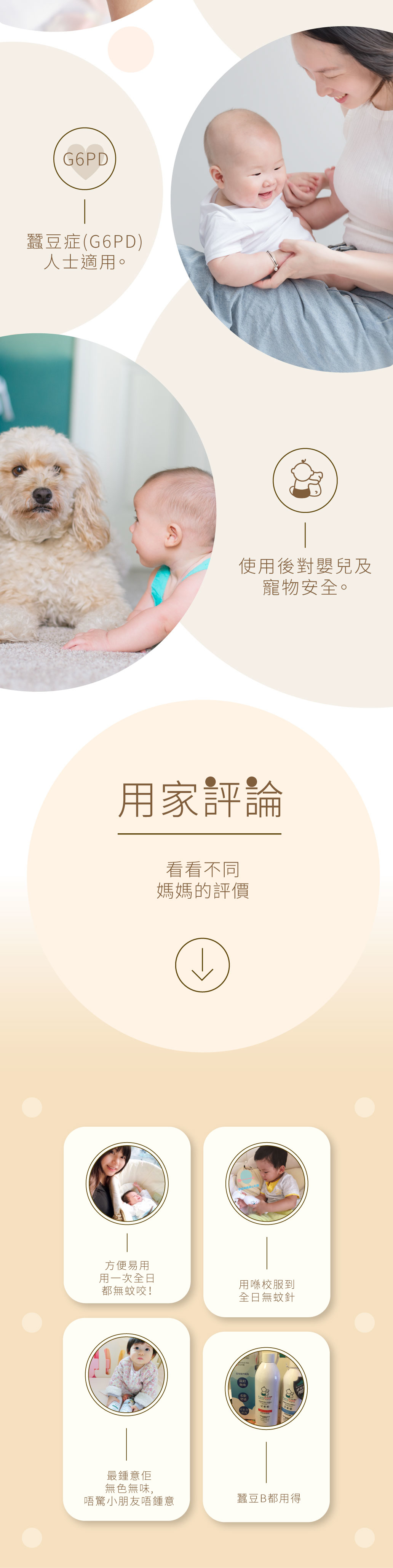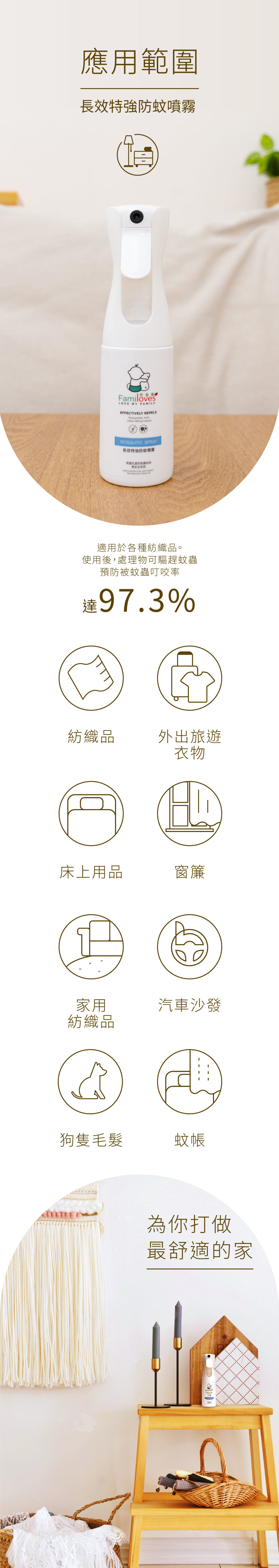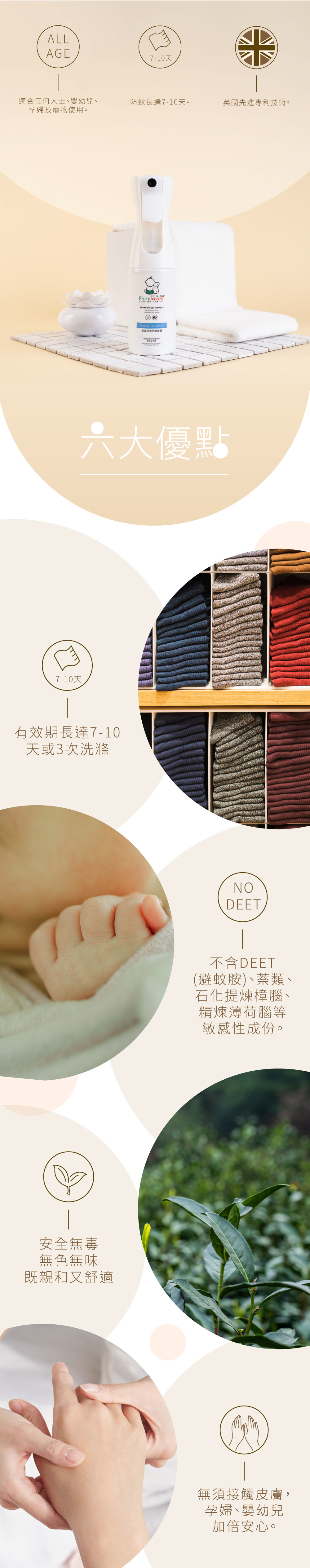 本產品是一款安全方便的防蚊蟲噴霧。能夠有效驅除蚊子、蠓、臭蟲、蒼蠅及跳蚤叮咬。產品能夠令蚊蟲的神經系統偵測到威脅,產生擊退作用,對預防蚊蟲吸血和叮咬的效率高達90%,適合患有蠶豆症(G6PD) 的人士使用,讓使用者可安心使用。 適用於各種紡織品,例如睡袋及其他戶外裝備、運動及戶外服裝、蚊帳及其他家用紡織品等。經處理的紡織品將持久長效,有效期長達7 -10天(若消費者無法按照標準量使用,則無法達到此有效期)。