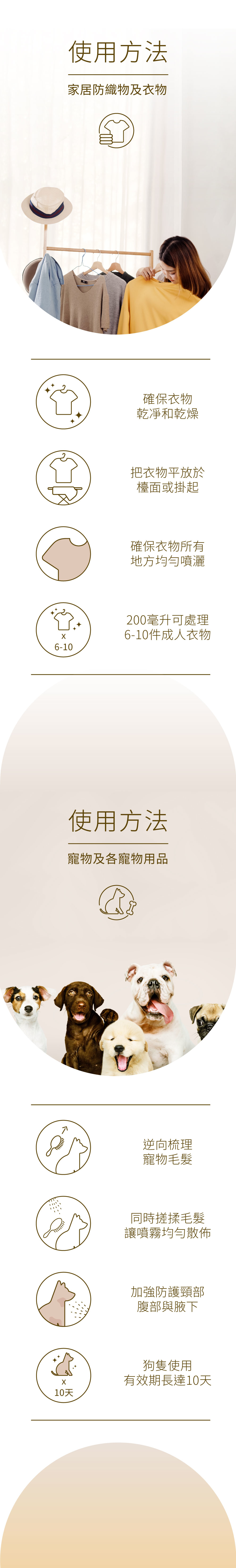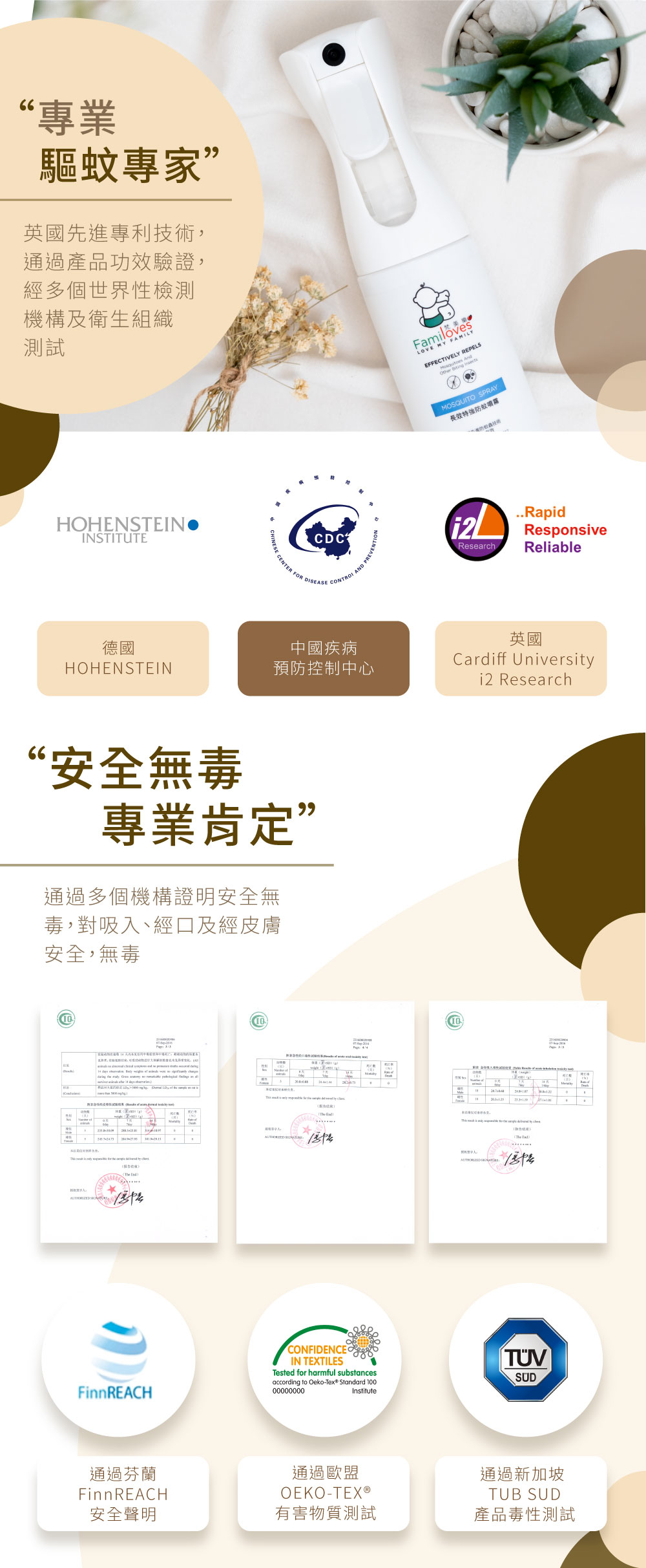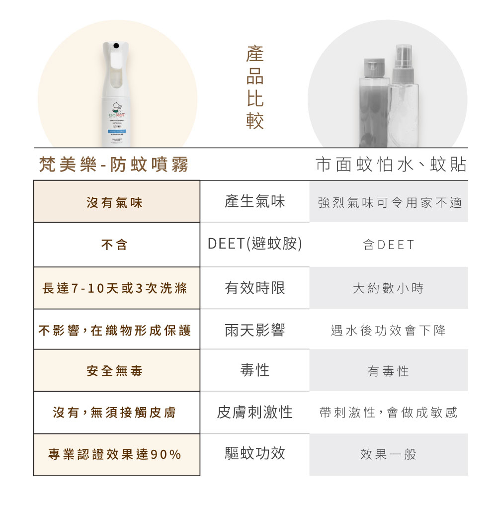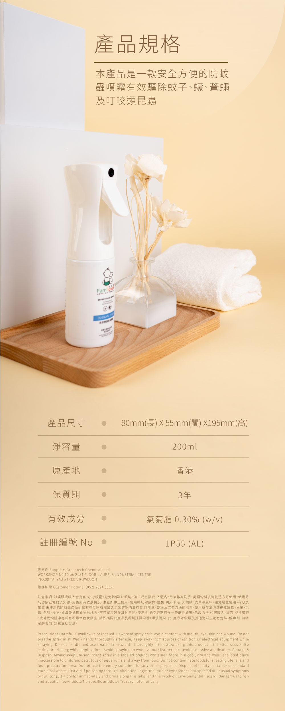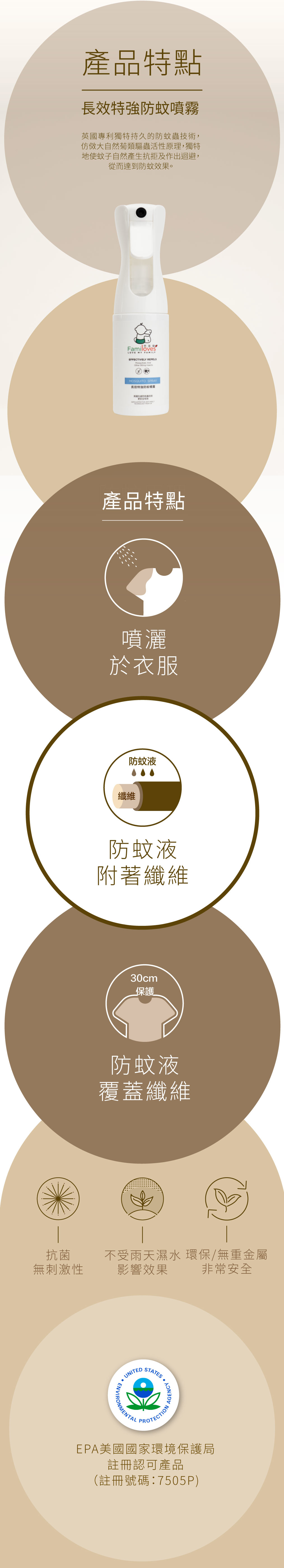本產品是一款安全方便的防蚊蟲噴霧。能夠有效驅除蚊子、蠓、臭蟲、蒼蠅及跳蚤叮咬。產品能夠令蚊蟲的神經系統偵測到威脅,產生擊退作用,對預防蚊蟲吸血和叮咬的效率高達90%,適合患有蠶豆症(G6PD) 的人士使用,讓使用者可安心使用。 適用於各種紡織品,例如睡袋及其他戶外裝備、運動及戶外服裝、蚊帳及其他家用紡織品等。經處理的紡織品將持久長效,有效期長達7 -10天(若消費者無法按照標準量使用,則無法達到此有效期)。一些含有氯菊酯的產品,可能令部份品種貓隻產生過敏