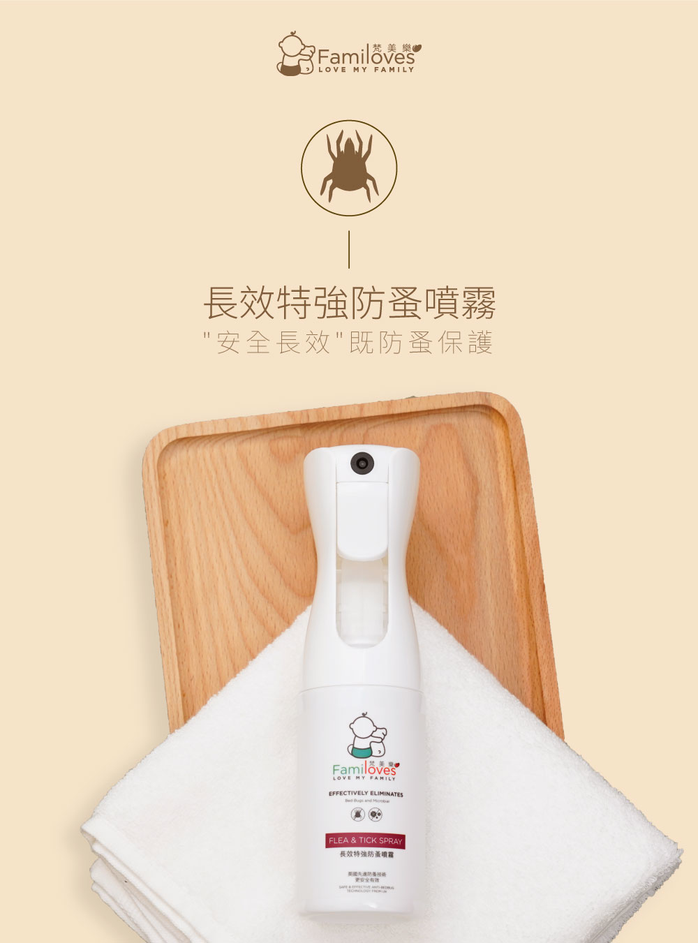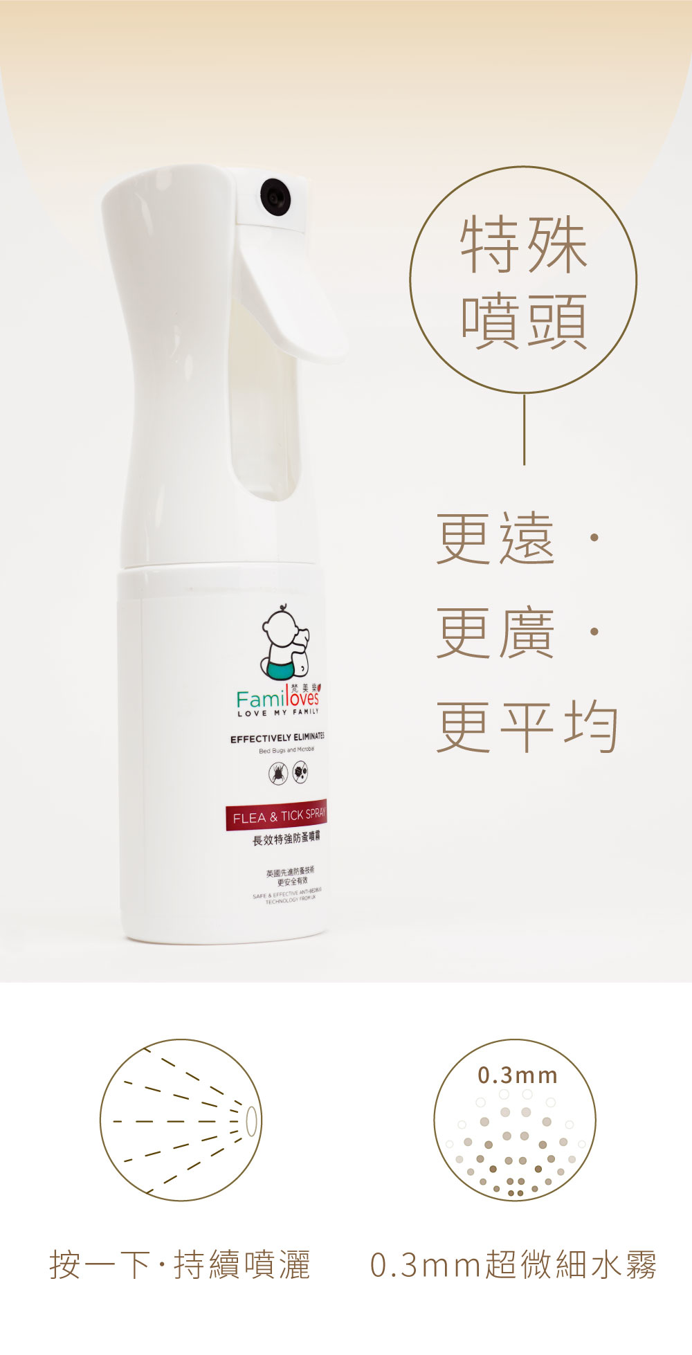 本產品是一款防蚤紡織物噴霧,能夠有效防止蚤、蚊蟲、蟎蟲等昆蟲的叮咬。產品能夠使得昆蟲的神經系統偵測到威脅,從而產生擊退作用。經處理的織物將持續有效期3個月(若消費者無法按照標準量使用,則無法達到此有效期)。