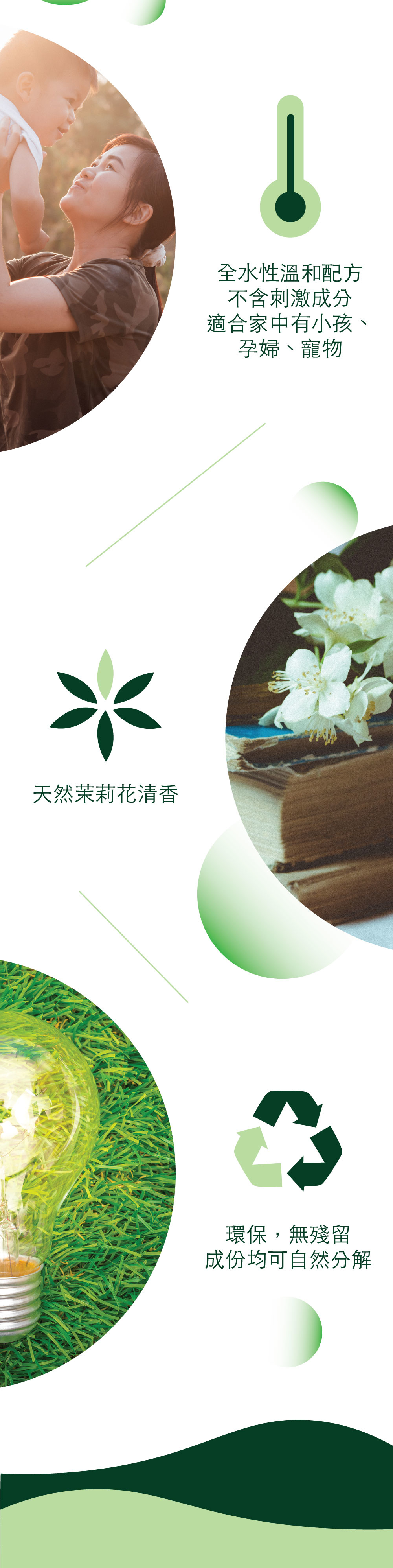 • 主要成分:  去離子水、Proprietary Blend of Quaternary Ammonium Compounds, 茉莉花香味。