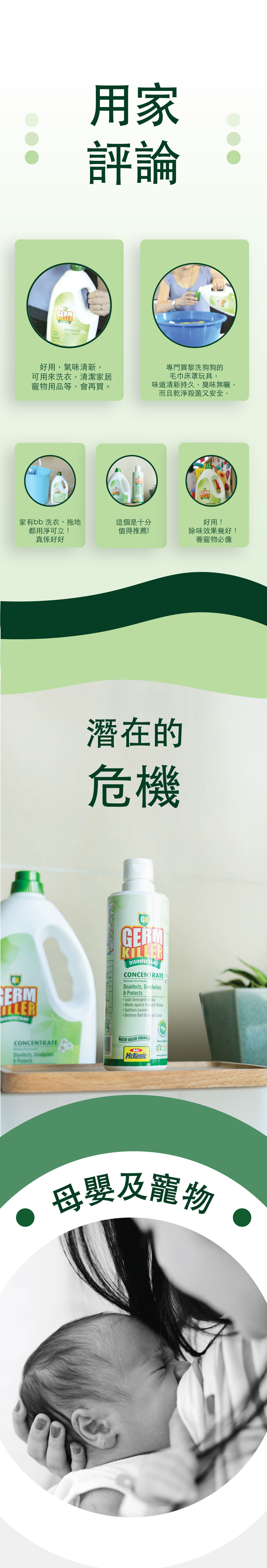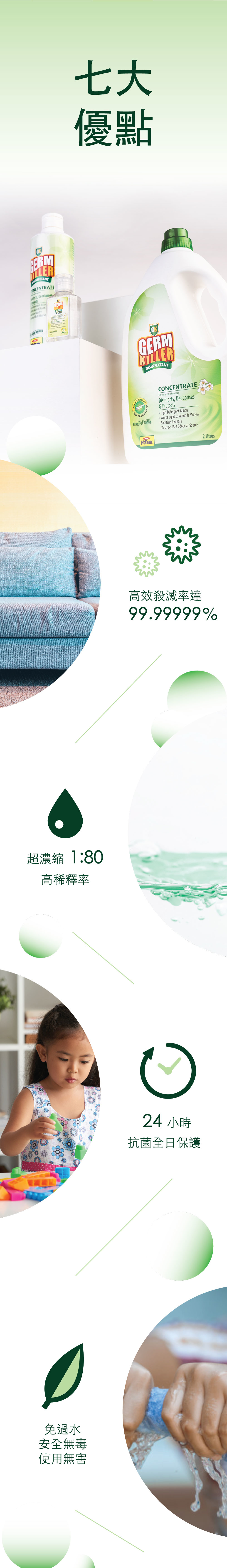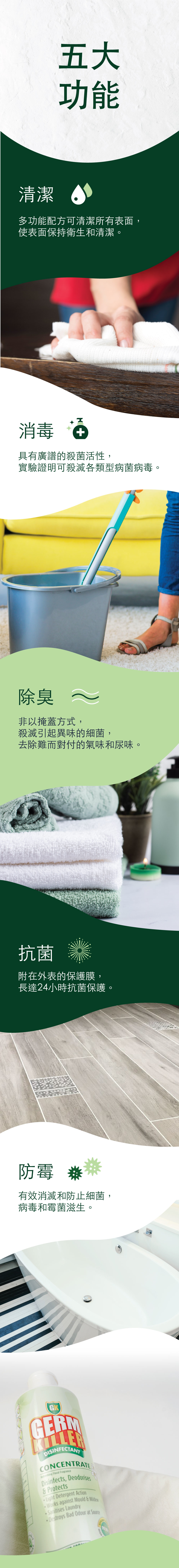 適用於拖地、洗衣、浸玩具的 GK淨可立 殺菌濃縮液是一種用途廣泛的優質水溶性消毒藥水,有效殺死99.9999%的細菌和病毒。使用時並會散發著清新茉莉花香,不用過水,抗菌長達24小時,無需每2小時消毒一次,無殘留,不傷皮膚,可應用於織物上(絕不損衣物纖維)。所有成分可自然分解,安全無毒,適合家裡有嬰兒、孕婦、寵物每天使用,十多年來深受歐美各個家庭信賴和愛戴。
