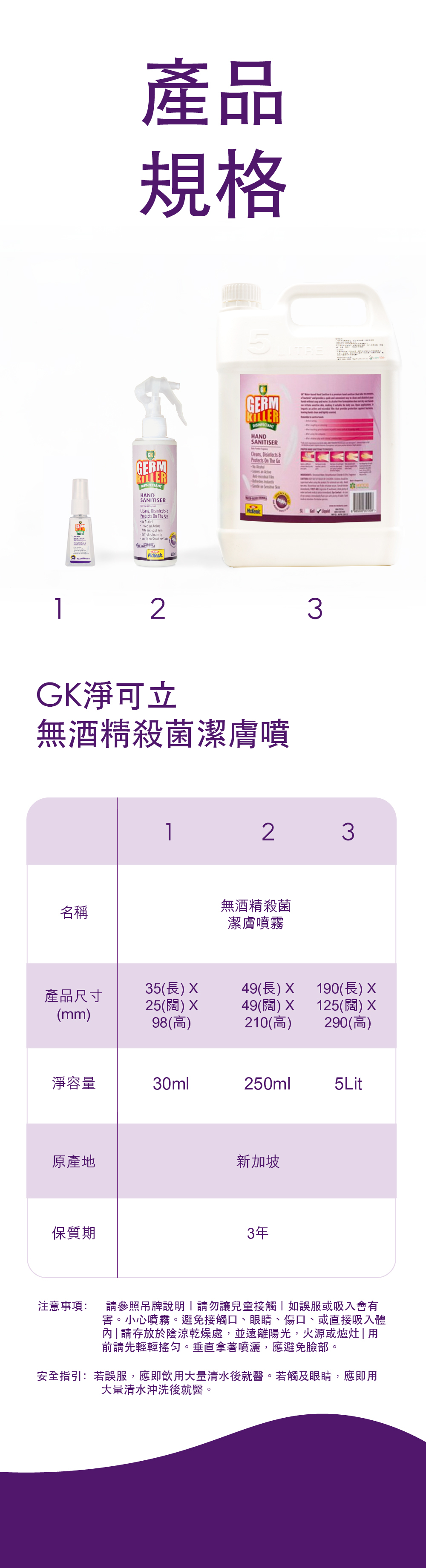 適用於消毒雙手的 GK淨可立 殺菌消毒洗手噴霧是一種用於潔手的優質水溶性消毒藥水,殺菌高逹99.99999%,它提供了一個快速和便捷的方式來清潔和消毒雙手。不含酒精,不會令到皮膚乾燥和引起刺激敏感,適合任何肌膚和小朋友使用。用後更留下一個24小時抗菌效能,全日保護你的雙手。