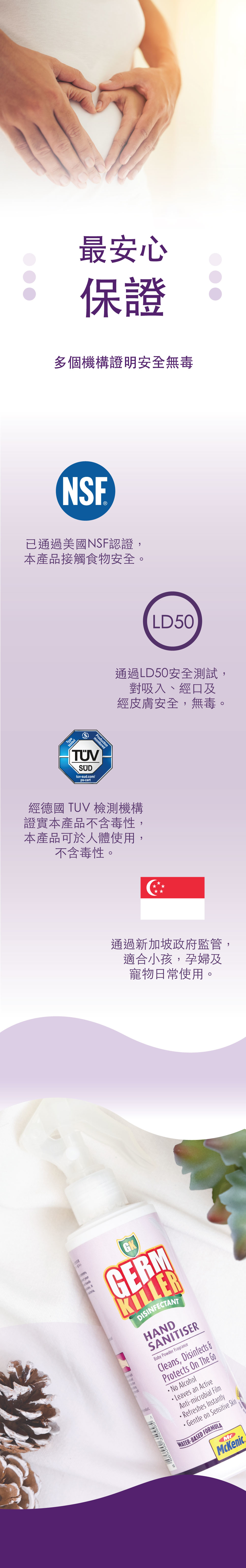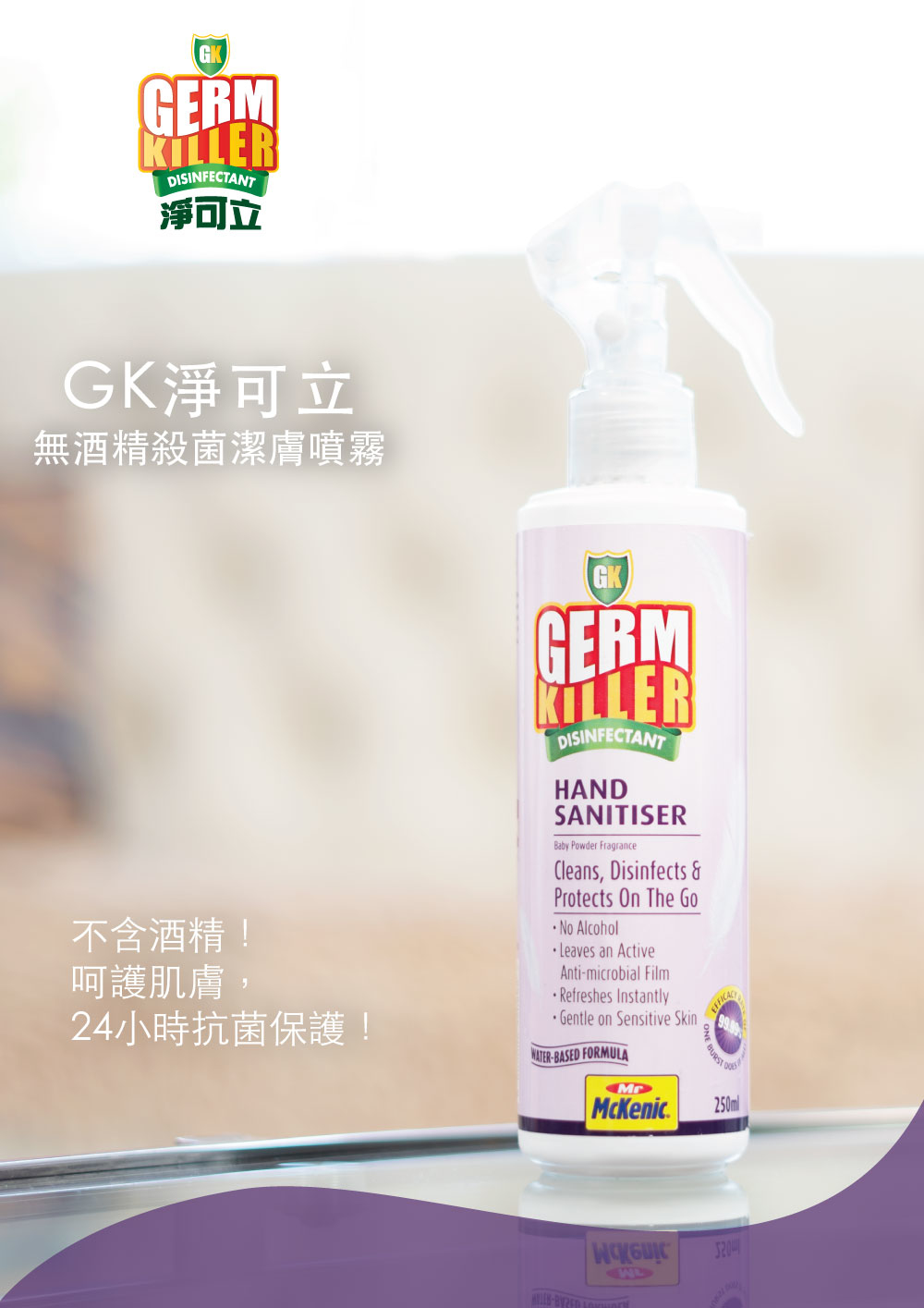 適用於消毒雙手的 GK淨可立 殺菌消毒洗手噴霧是一種用於潔手的優質水溶性消毒藥水,殺菌高逹99.99999%,它提供了一個快速和便捷的方式來清潔和消毒雙手。不含酒精,不會令到皮膚乾燥和引起刺激敏感,適合任何肌膚和小朋友使用。用後更留下一個24小時抗菌效能,全日保護你的雙手。