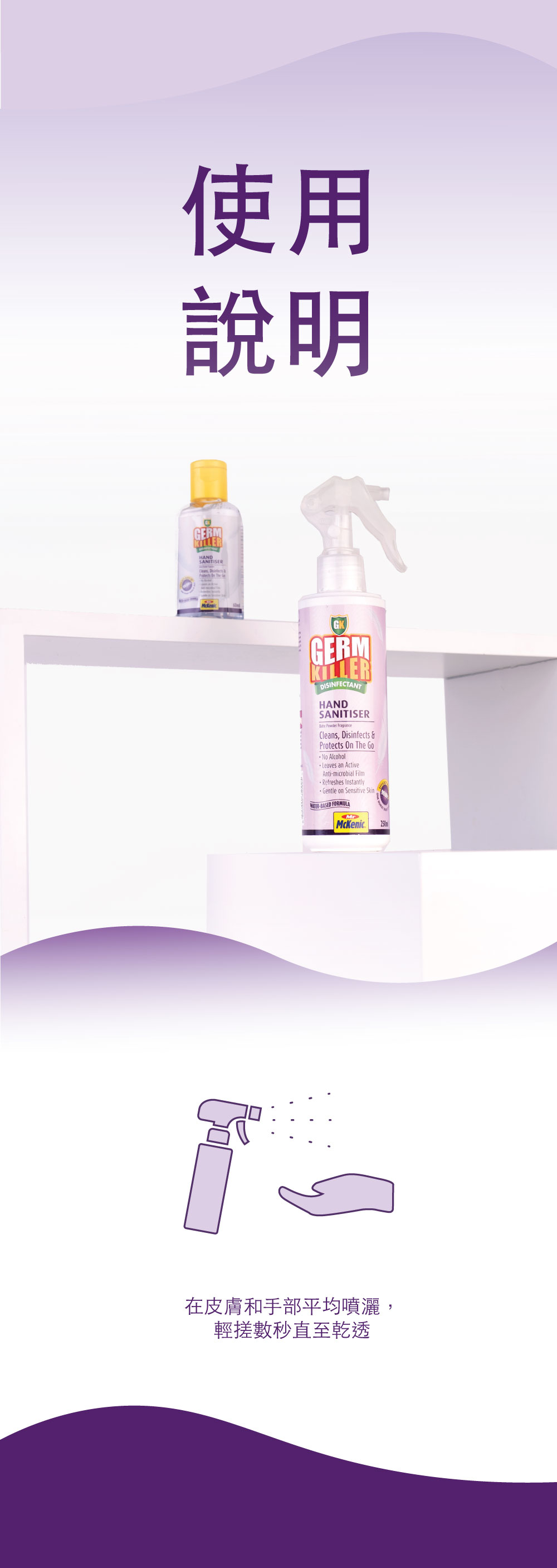 適用於消毒雙手的 GK淨可立 殺菌消毒洗手噴霧是一種用於潔手的優質水溶性消毒藥水,殺菌高逹99.99999%,它提供了一個快速和便捷的方式來清潔和消毒雙手。不含酒精,不會令到皮膚乾燥和引起刺激敏感,適合任何肌膚和小朋友使用。用後更留下一個24小時抗菌效能,全日保護你的雙手。